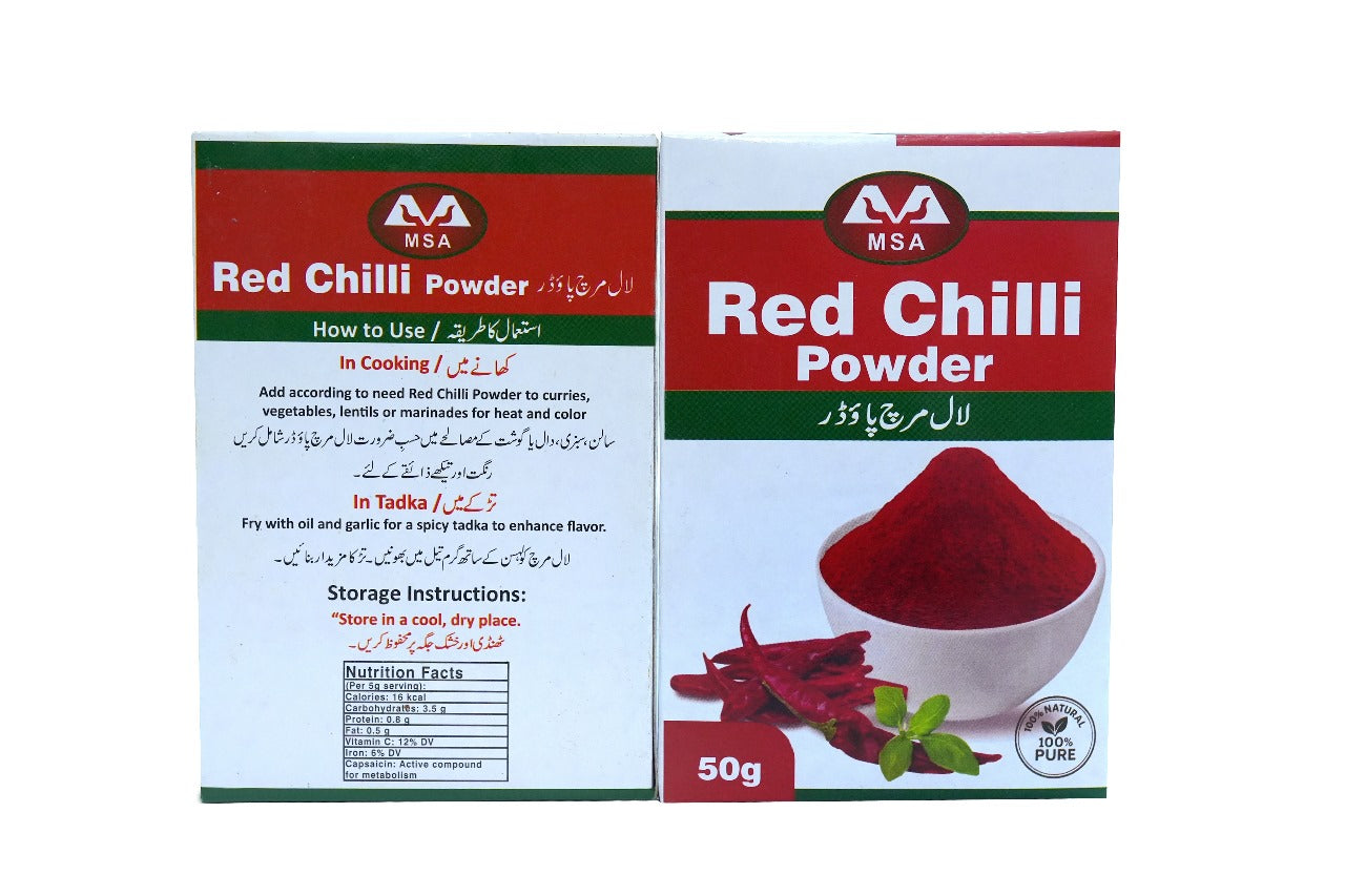 Bring bold flavor to your meals with MSAโs 100% Pure Red Chilli Powder. Perfect for everyday Pakistani cooking, this 50g pack adds natural color, aroma, and spice to your favorite dishes.